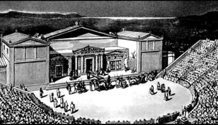 كان العرض في بلاد الإغريق يتخذ في آن واحد شكل احتفال ديني وتظاهرة شعبية، فكان يحتفظ بالطابع القدسي للأعياد الديونيزية، مضيفاً إليه الشاعرية من تراكمات ثقافية وشعبية، وأعادت تصور العروض على أساس أثري، فإن العناصر التي يمكننا اعتبارها مستقاة من مشاهد يتليفوس لأسخيلوس، والتي رسمت على كوب محفوظ في متحف بوسطن، لتلقي لنا على نقاط غامضة، حيث مر البناء المسرحي الإغريقي بمراحل كثيرة من بناء خشبي إلى البناء الحجري.