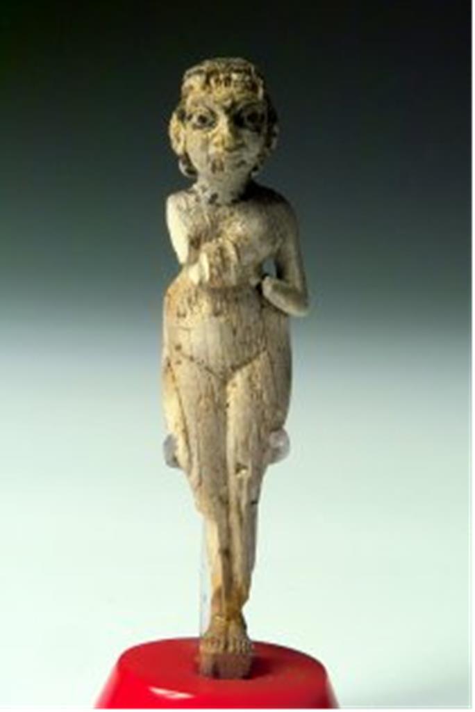 ـ تمثال من العاج لامرأة عارية: واقفة (8.4 × 2) سم ترفع نهديها بيديها، معالم وجهها دقيقة وشعرها معصوب من الخلف.