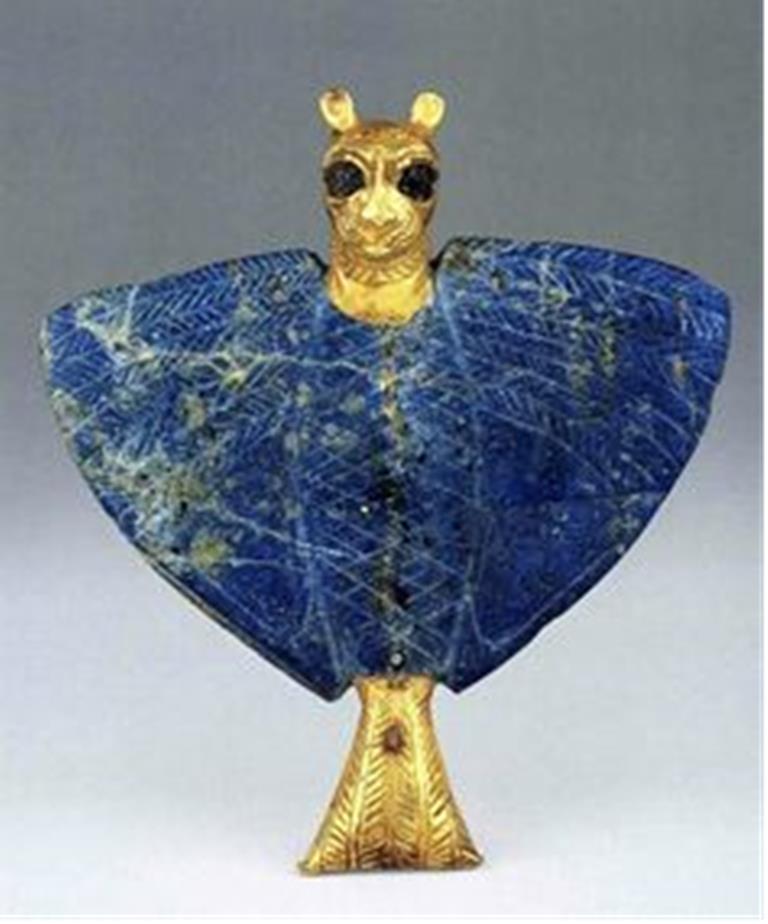 ـ نسر برأس أسد (آنزو): الرأس والذيل من الذهب والعيون منزلة وبقية الجسم من اللازورد المحزز على شكل معينات وعليه ثقوب كان يثبت بها النسر بخيط وهذا الشكل هو شعار الرب نينجرسو الرافدي.