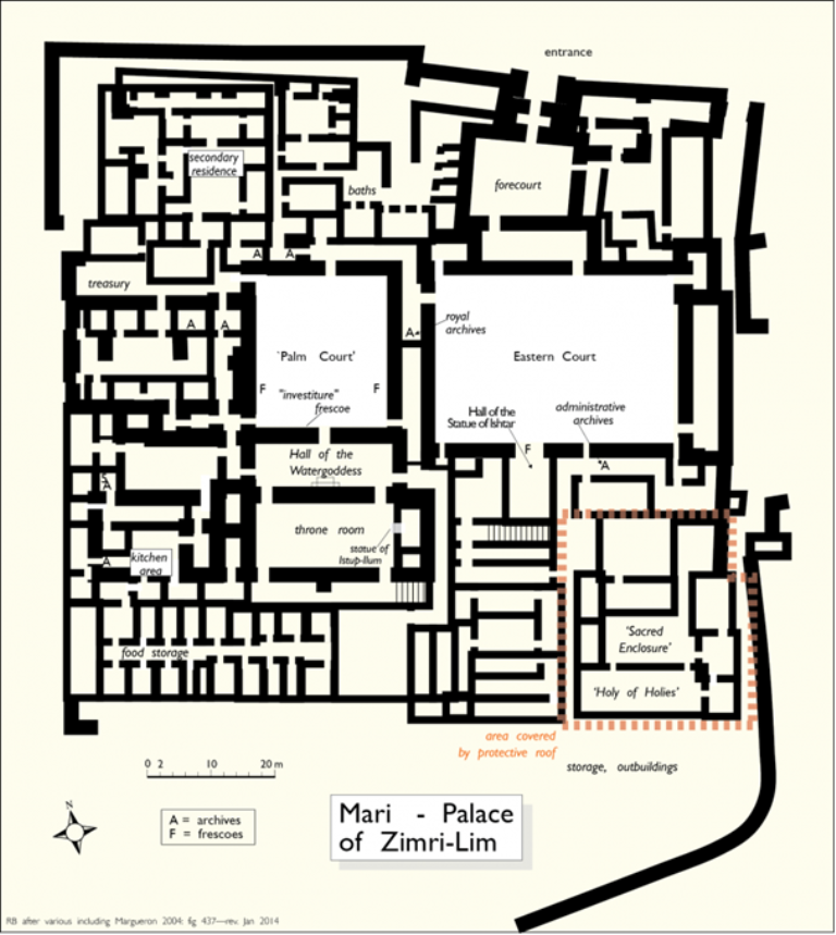 يجتاز الزائر للقصر مجموعة من الباحات الصغيرة والممرات المتعرجة ليصل إلى باحة سماوية كبيرة (49 × 33) متراً أطلقت عليها باحة النخيل. وتقع قاعة جلسات الملك على أحد أضلاع الباحة. ويستند إلى حائطها الجنوبي منصة منخفضة تدل على موضع العرش. وكانت القاعة مزينة بالرسم الجدارية الملونة تمثل مشهد التنصيب على العرش للملك زمري ليم ممسكاً بالعصا والحلقة رمزاً للسلطة تناوله إياها الربة عشتار بحضور بعض الأرباب.