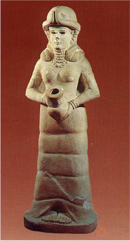 أما النساء فكن واقفات والقدمان على نفس المستوى، أو جالسات واليدان مضمومتان إلى الصدر، ويلبسن رداء يستر الكتف الأيمن. وقد ارتدت الكاهنة طاقية تشبه البيريه (بولوس)، وقد نزلت العيون بالصدف أو بالمواد الأخرى النادرة.